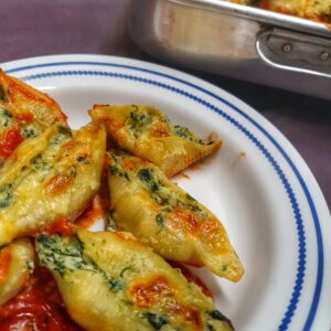 - Boil the jumbo pasta shells until they are al-dente (cooked but firm). Fill the pasta shells with the spinach & ricotta mixture. Avoid the temptation to overfill. You may want to use a piping bag for this stage.