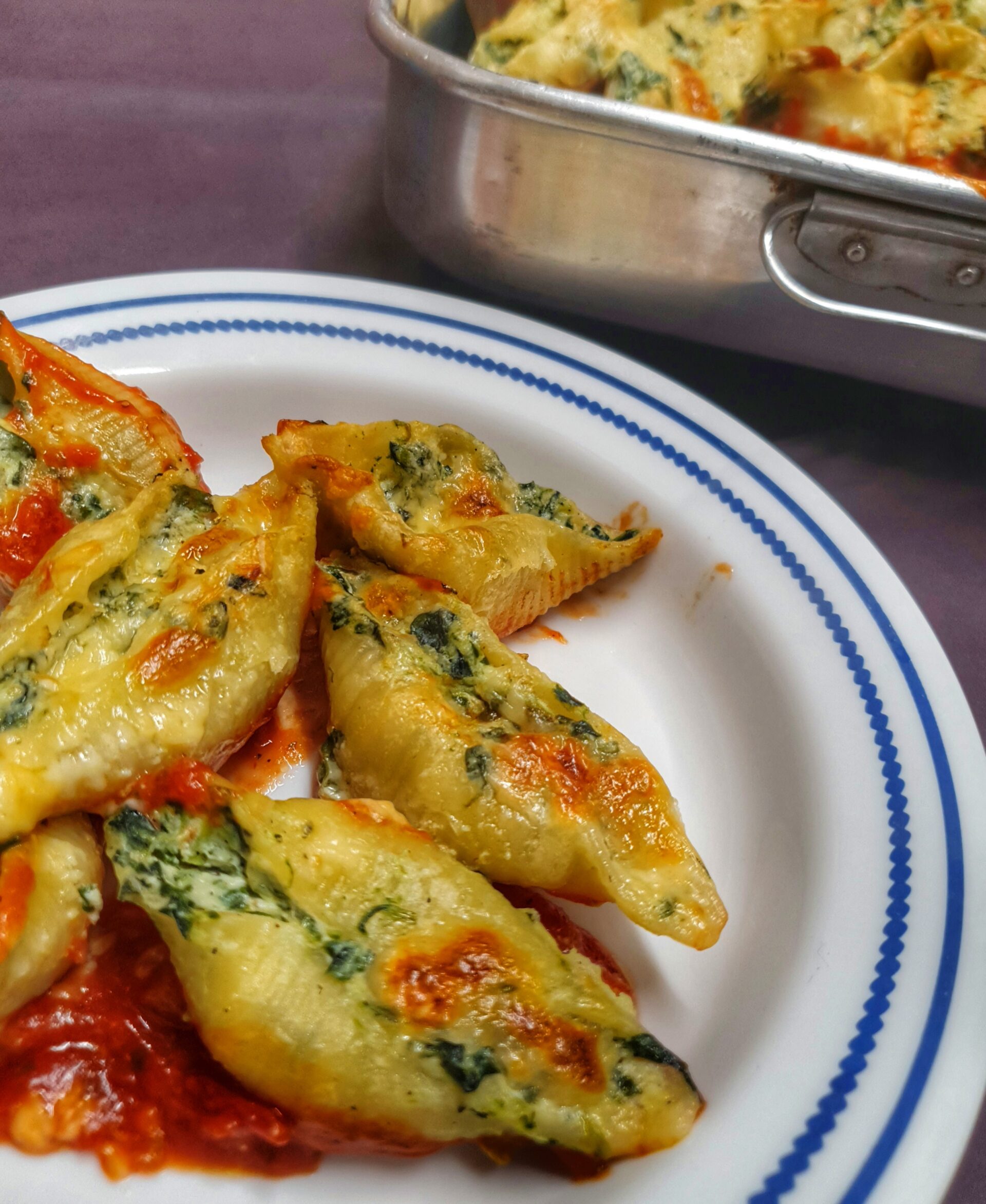 - Boil the jumbo pasta shells until they are al-dente (cooked but firm). Fill the pasta shells with the spinach & ricotta mixture. Avoid the temptation to overfill. You may want to use a piping bag for this stage.