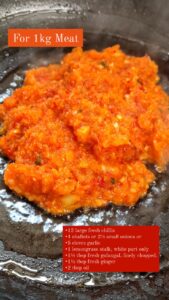 - 1/3 cup kerisik (roasted desiccated coconut) dry fry until colour slightly changed then pound to pestle and morter (add to other ingredients = more intense flavour)