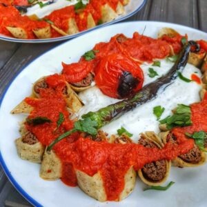 Adana Kebabs grilled over smoldering embers then wrapped in Lavash bread, topped with a rich and tangy tomato sauce and served with a garlicky yogurt sauce. This dish is finished with foaming butter!