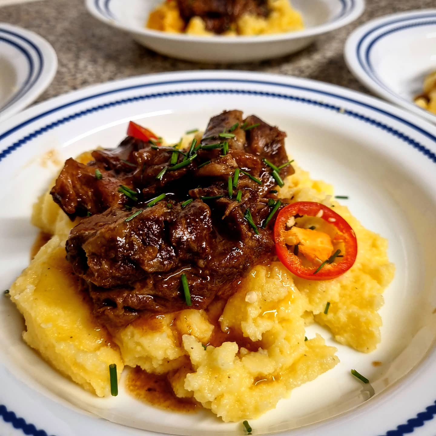 - Serve with creamy polenta and garnish with red chilli, chives and sesame.