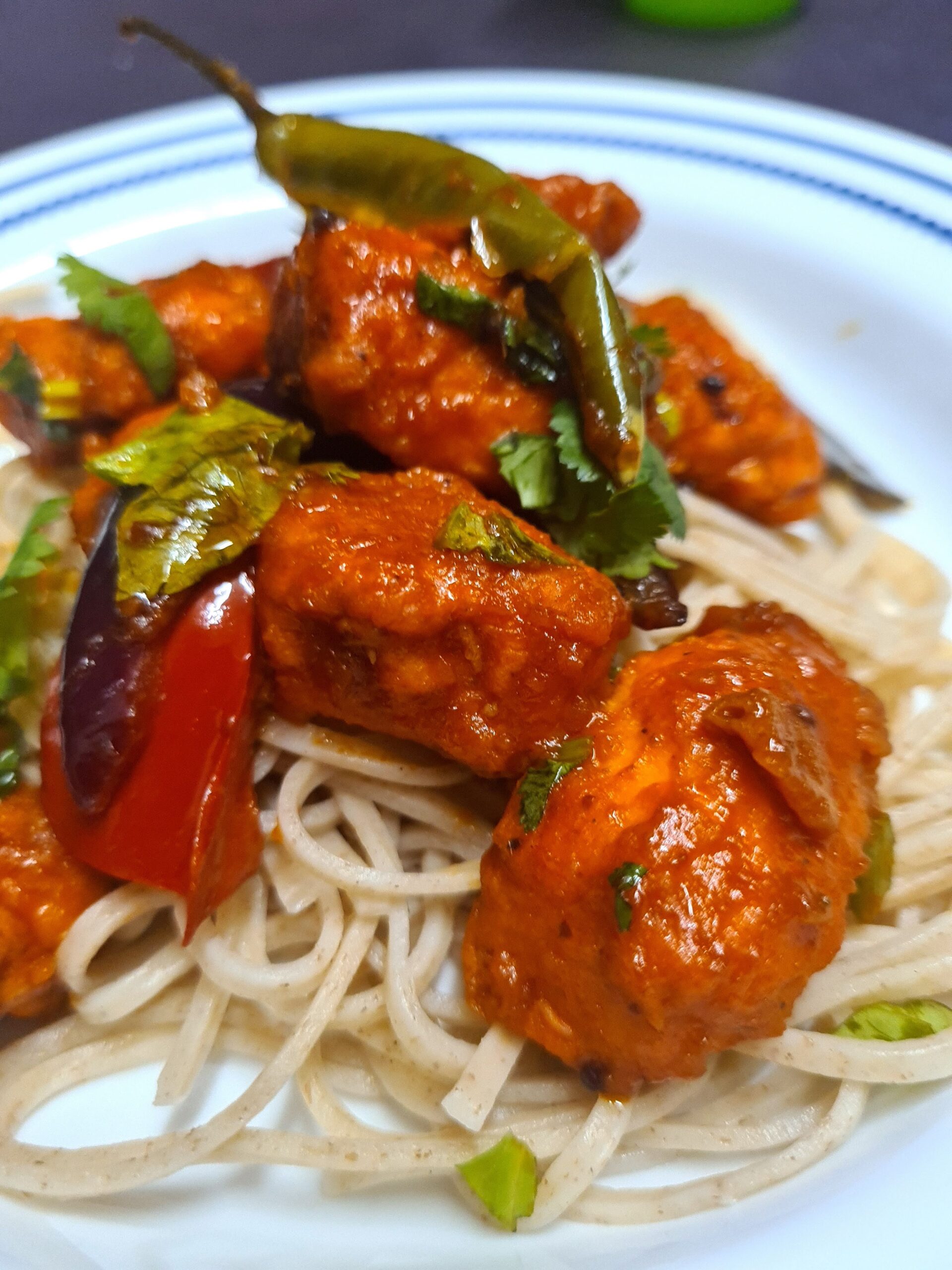 Crispy-coated boneless chicken in a hot and spicy chilli sauce.